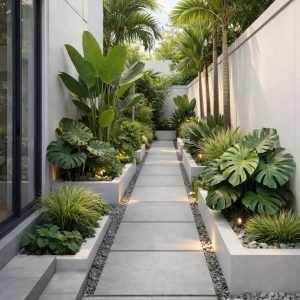 Taman tropis menonjolkan penggunaan tanaman hijau yang rimbun. Konsep ini menciptakan suasana alami yang kuat sehingga rumah terasa lebih sejuk.